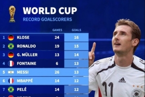 世界杯历史射手榜:克洛泽、大罗前二,梅西第五姆巴佩第六