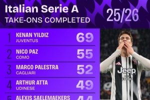 体育资讯4月3日讯 Squawka列出了本赛季意甲成功过人排名,伊尔迪兹69次居首,尼科·帕斯55次第二。