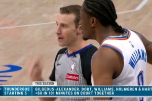 比赛中转播方晒出一组数据:本赛季雷霆摆出亚历山大+多特+杰伦威+霍姆格伦+哈滕的首发组合一共只打了101分钟,期间正负值高达+60!