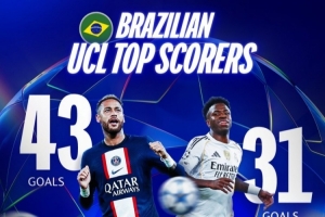 维尼修斯欧冠打进31球超越卡卡,巴西球员中仅少于内马尔
